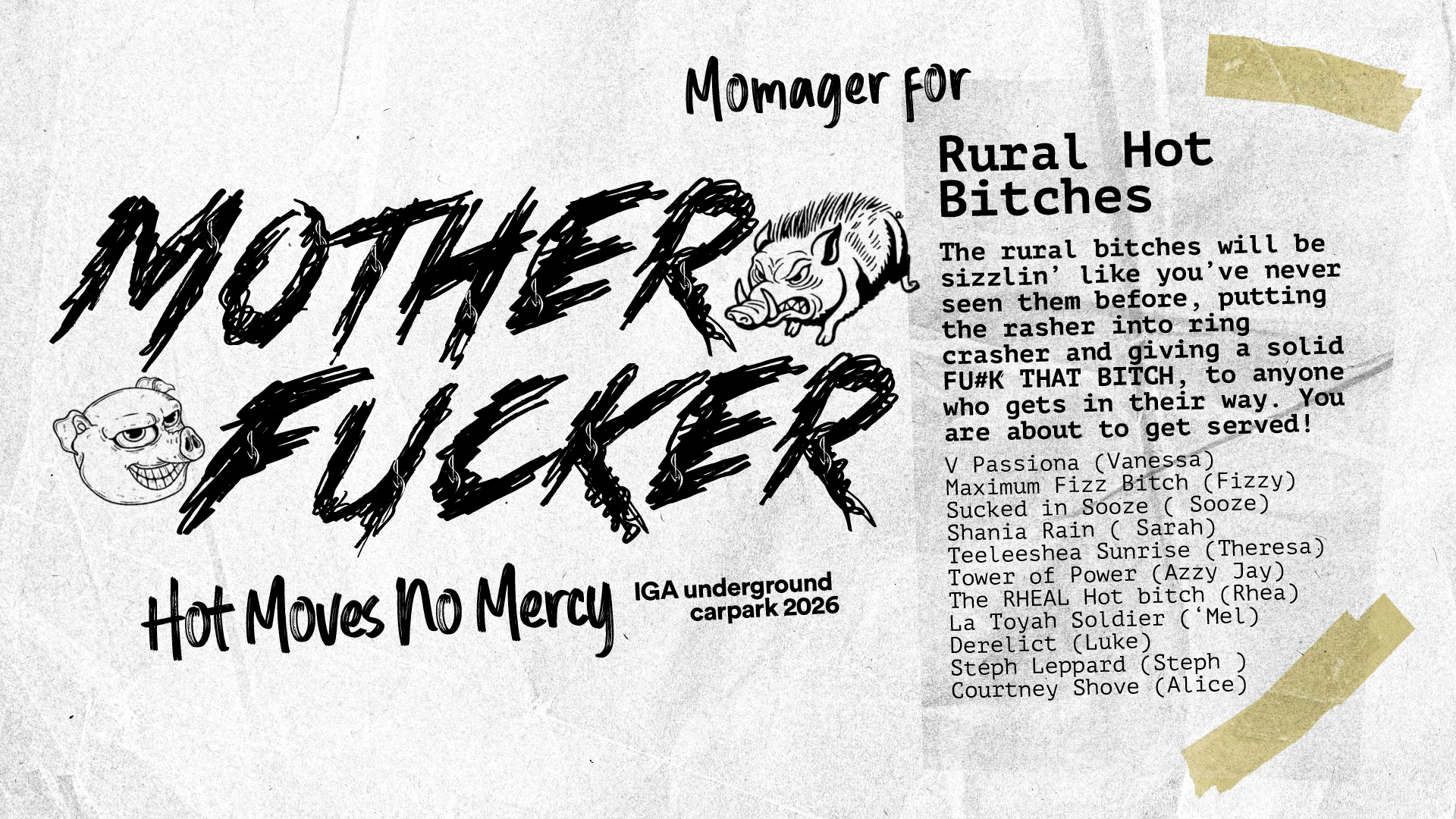 Led by the mysterious, vengeful Mother Fucker — the forgotten Mom of the Saturday slot! Ruthless, charismatic, and self assured to the point of arrogance, Mother fucker is here to dominate. Unpredictable and volatile – she’s above the law and doesn’t hold back. There’s only one thing she loves more than her rescue pigs – and that’s attention. She’s a late in life lesbian who has mastered the art of turning the straighties 180. In fact, I think she’s kissed all of these Moms at some point. If her team’s anything like her, they’re going to be smoking hot and ready to dominate! Someone is about to get served! Putting the rasher into ‘ring crasher’ it’s MOTHER FUCKER!”