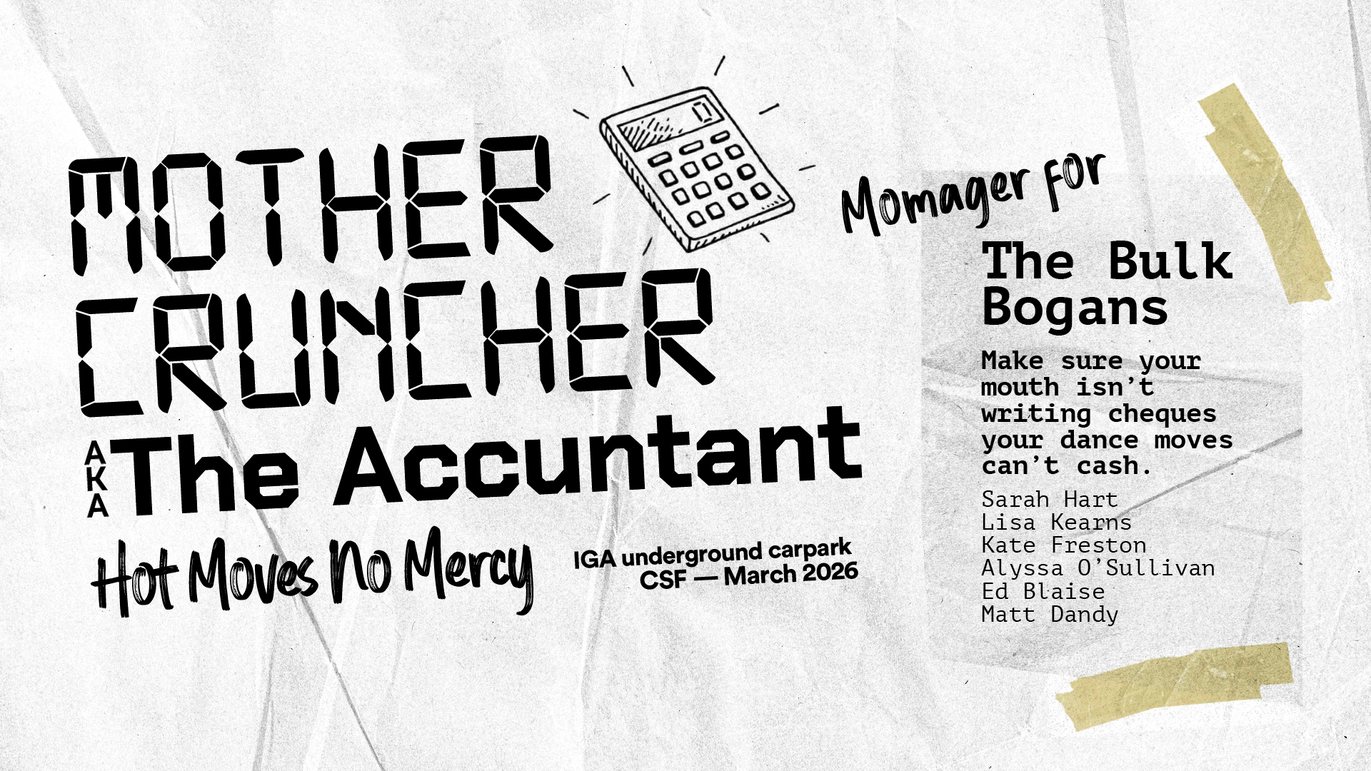 With a head for numbers and a body for rolling, Mother Cruncher can find her way around a spreadsheet faster than you can say “what’s the position of my assets!”. Come tax time she sure knows how to work the fringe benefits, if you know what I mean. Well they don’t call her the a-CUNT-tant for nothing! With ever the eye for a bargain, even her dancers come in bulk! Mother Cruncher is here with her team, the Bulk Bogans, a group of dancing wrestlers holding onto their former glory like it was a discount coupon for the pharmacy. They are here tonight to give your figures a good working over and to make sure that your mouth isn’t writing cheques that your dance moves can’t cash!