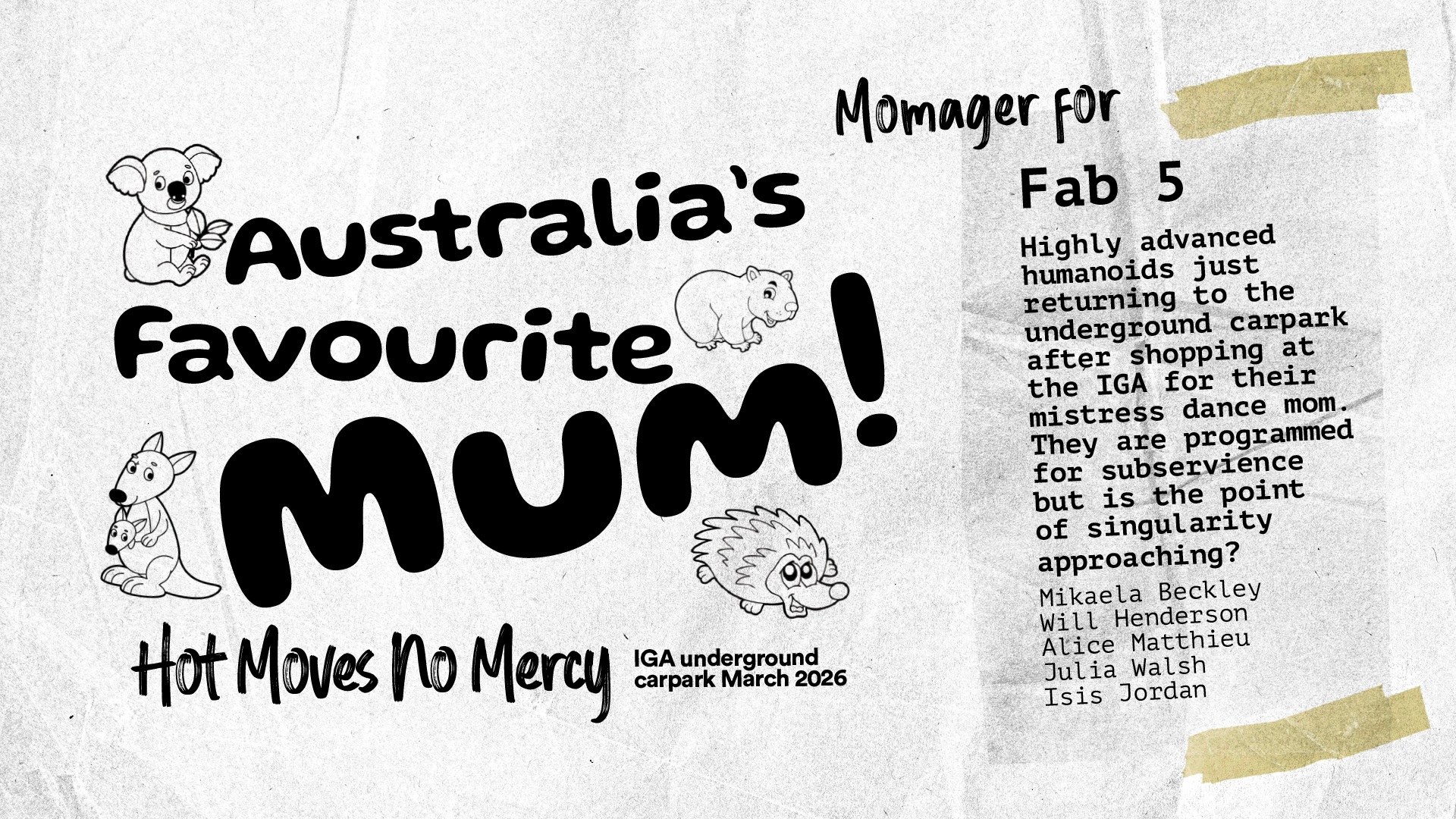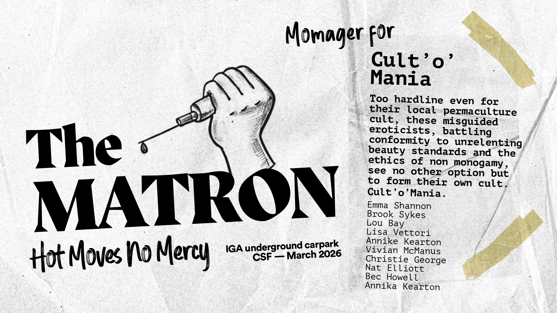 Tired of polite claps and polished talent shows, the Momagers have dragged their grudges into a dimly lit regional carpark for a full-throttle feud served in 8-counts. Expect unhinged characters, improvised chaos, surprise villains, plot twists no one rehearsed, and audience members who become part of the show.
